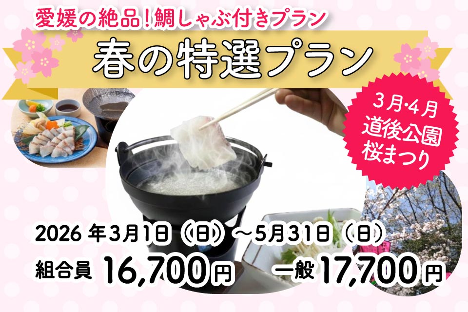 Recommended planおすすめ宿泊プラン 【期間限定】春の特選 1泊2食付きプラン 【期間】2026年3月1日〜2026年5月31日 真鯛養殖 生産量日本一!愛媛県自慢の「鯛」を使った鯛しゃぶ付宿泊プランです。約300本の桜が彩る散歩スポット「道後公園」は目の前! 愛媛の春とおいしい料理をご堪能ください。 【期間限定】冬の特選 1泊2食付きプラン 【期間】2025年12月1日〜2026年2月28日 寒い季節にぴったりの“温泉”と“すき焼き”と“日本酒”で癒され温泉旅!すき焼き鍋付きの季節の会席料理と愛媛の地酒でちょっと贅沢なひとときを! 旬彩「媛」プラン にぎたつ会館自慢の檜風呂(道後温泉引き湯)にゆっくり入って、新鮮な旬の素材を生かした彩りゆたかなお料理をぜひ、ご賞味ください。 瀬戸の鯛づくしプラン 瀬戸内の鯛を使用した「鯛づくし」料理をぜひご賞味ください。 伊予路プラン 「鯛そうめん」や「ふくめん」など愛媛の郷土料理をご賞味ください。 【大学生限定】ゼミ・サークル合宿応援プラン 宿泊(朝食付き)に会議室や夕食などがセットになった大学生限定のプランです。 【1日1組限定】にぎたつファミリープラン ご家族の中に小学生のお子様がいらっしゃる場合のプラン。小学生以下の宿泊料金20%OFF! プランをすべて見る