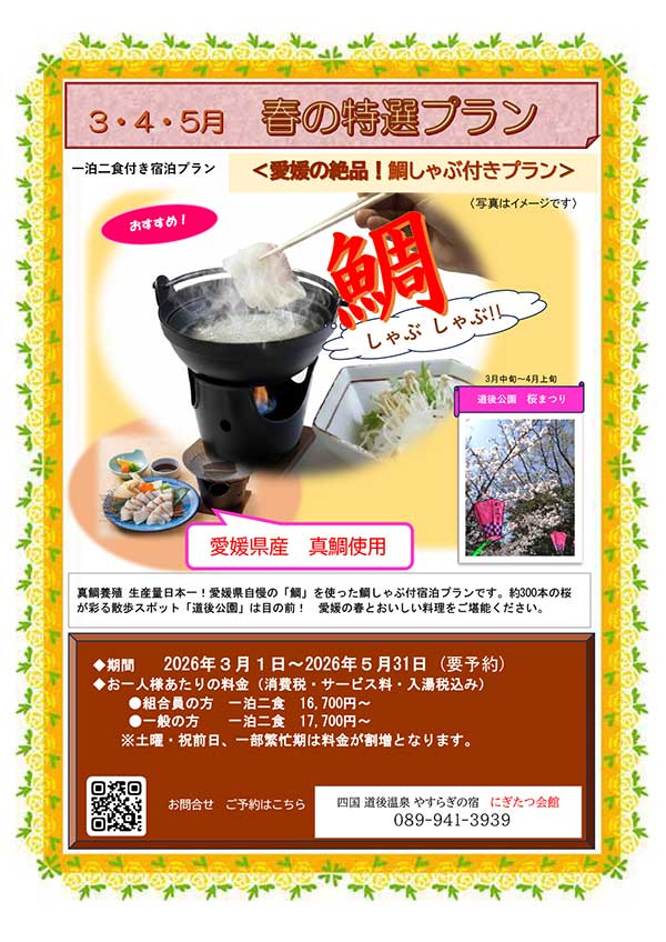 【期間限定】春の特選プラン鯛しゃぶ付きプラン 1泊2食付宿泊プラン