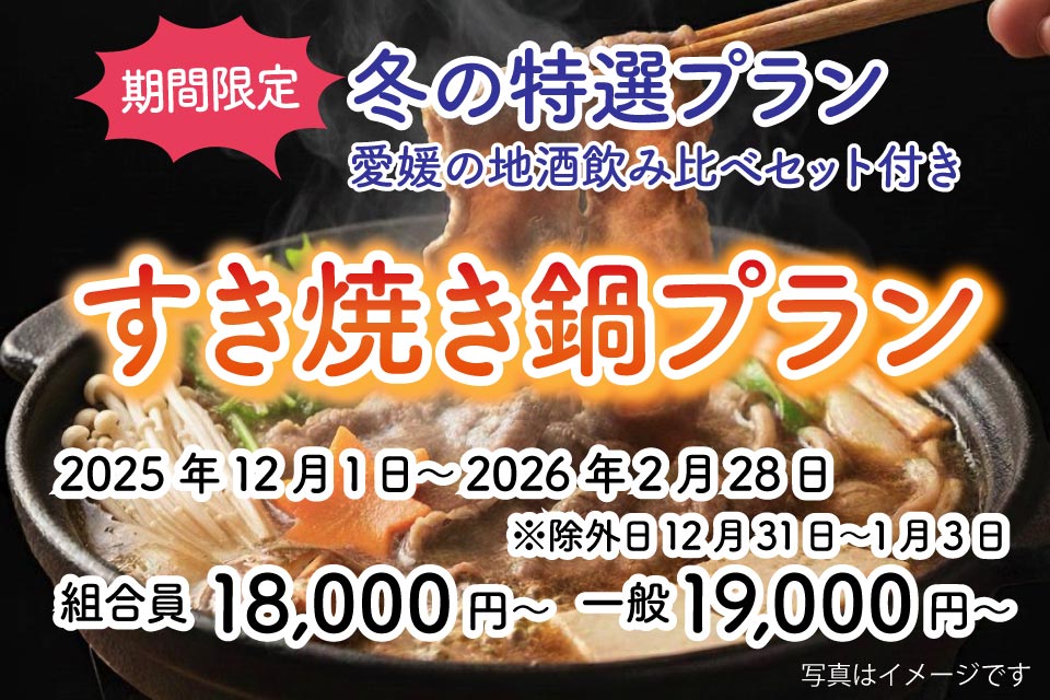 News新着情報 【期間限定】冬の特選 1泊2食付きプラン 【期間】2025年12月1日〜2026年2月28日寒い季節にぴったりの“温泉”と“すき焼き”と“日本酒”で癒され温泉旅!すき焼き鍋付きの季節の会席料理と愛媛の地酒でちょっと贅沢なひとときを! CASUAL PARTY 【期間】2026年1月6日~2026年2月27日 (土曜日・祝前日を除く)注ぎたてビア&ワインサーバーセルフ飲み放題と和洋オードブル CASUAL PARTY スペシャルプラン 【期間】2026年1月19日~21日の3日間限定!90分飲み放題(ビアサーバー&ワインサーバー)と鶏団子鍋+和洋オードブル+スイーツ お正月プラン・お年玉プラン 1泊2食付きプラン 【お正月プランの期間】2025年12月31日〜2026年1月3日【料理】夕食、朝食(バイキング)どちらも特別メニューをご用意いたします。お正月料理を存分にご堪能ください! 【大学生限定】ゼミ・サークル合宿応援プラン 宿泊(朝食付き)に会議室や夕食などがセットになった大学生限定のプランです。 NEWとくとくプラン・飲みとくプラン(NEW) ~組合員様向けニュープランをはじめました~ 休館日のお知らせ まことに勝手ながら、次の日を休館とさせていただきます。 1月の休館日:13日(火)~15日(木) 2月の休館日:16日(月)、17日(火) 3月の休館日:9日(月)、10日(火) 2月・3月の休館日は素泊まりプランのみ販売いたします。 【1日1組限定】にぎたつファミリープラン ご家族の中に小学生のお子様がいらっしゃる場合のプラン。小学生以下の宿泊料金20%OFF! お知らせをすべて見る